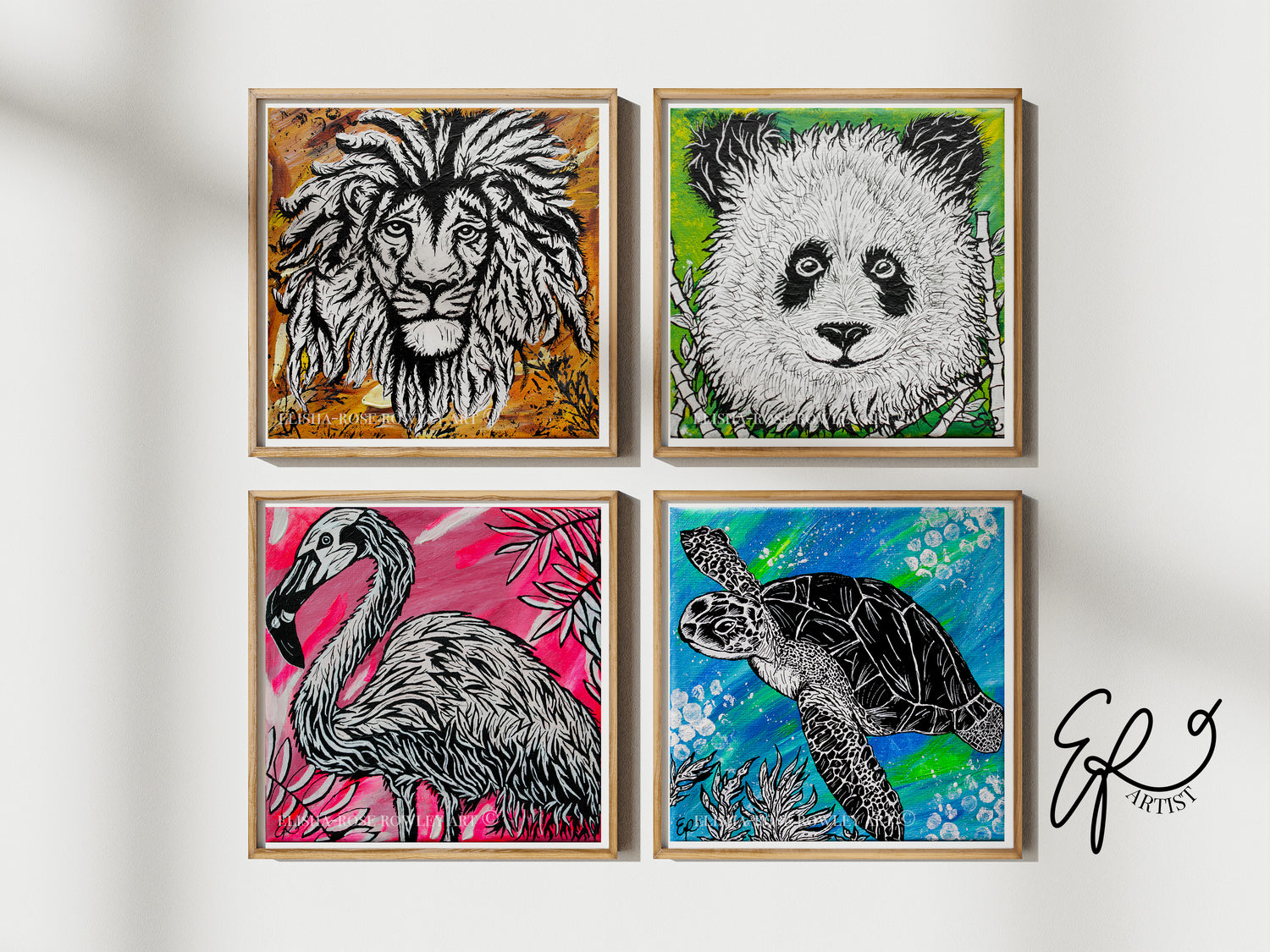 Discover the joy of vibrant illustrated prints by Elisha-Rose Rowley, from captivating travel scenes to the surprising wonders of 'Unexpected Pairings' - This delightful series features charming illustrations of animals in quirky situations, including pandas who find toilet paper irresistible, frogs leaping from champagne glasses and dogs diving into donuts.