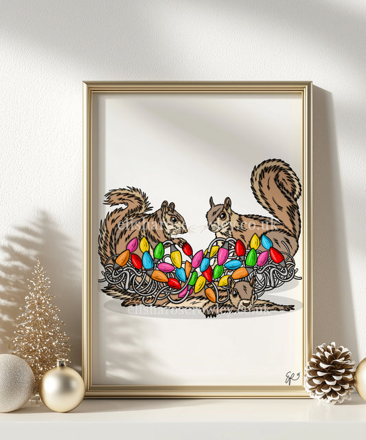 Merry Squirrels! Hand-drawn and Illustrated Art Print. Squirrels with Christmas Lights!