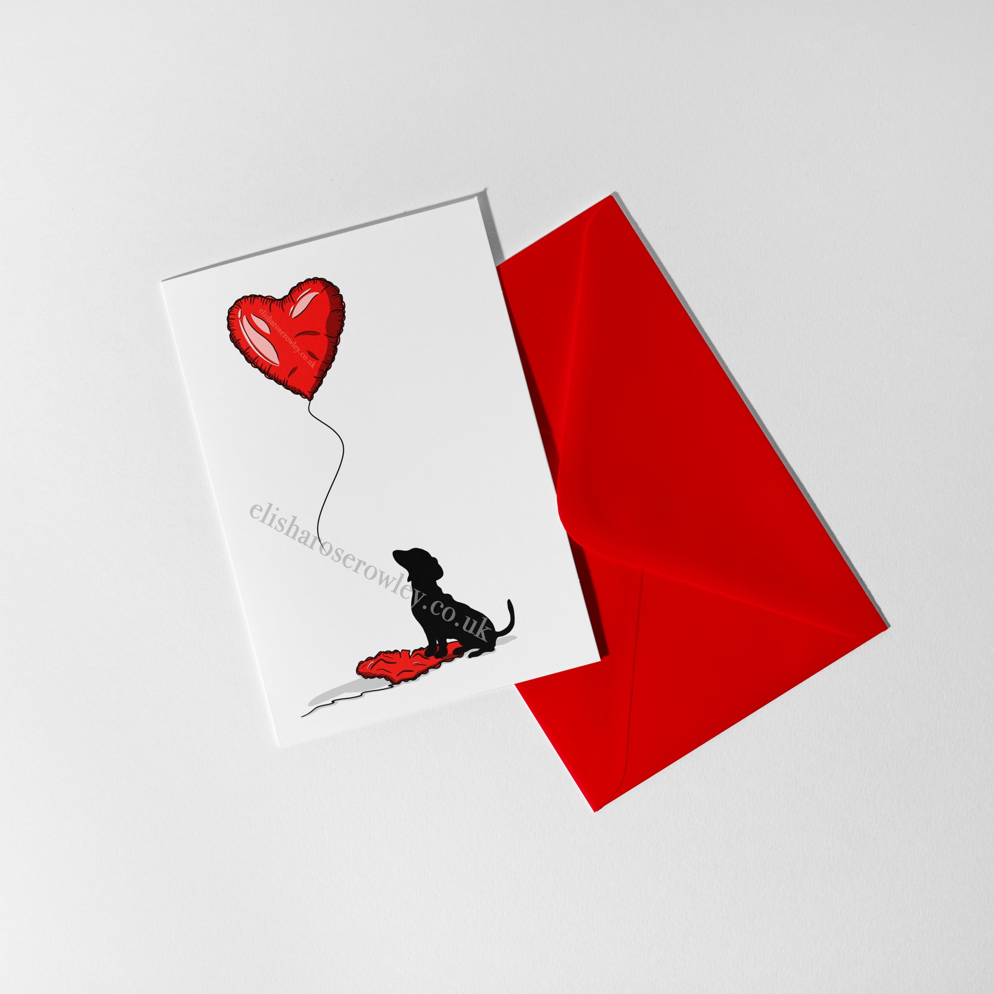Dog with a Heart Balloon Card, Designed, Hand-Illustrated and printed by Elisha-Rose Rowley.