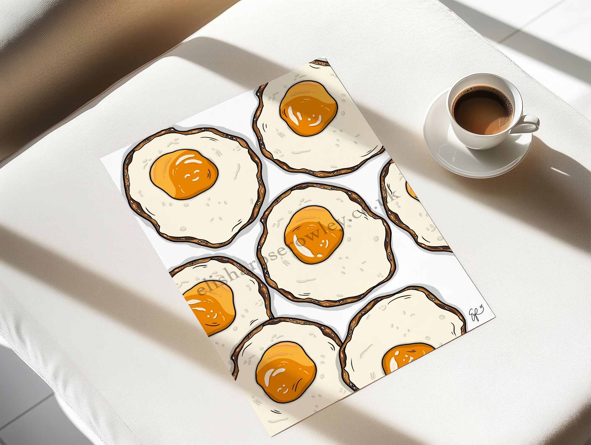 Hand-drawn and Illustrated Print perfect for your kitchen! Flat lay of Fried Eggs with hidden faces!